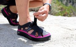 Introducing OOcandoo. Travel-ready, OOfoam technology and the patented OOFOS footbed take on a new versatile, lightweight and flexible design. The addition of a hook and loop fastener means you can easily slide these on while maintaining a secure fit for everything from creek crossings to global traveling. From post-hikecampsite to urban adventures, the OOcandoo brings Active Recovery and the ultimate OOfeel to any excursion.